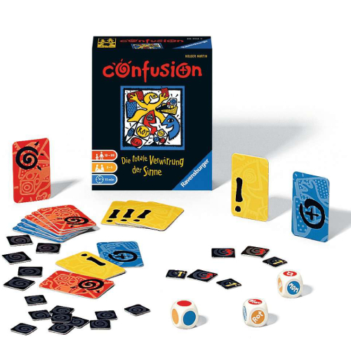 Bei Confusion gilt: Die Schrift zählt mehr als die Farbe. Ein Würfel zeigt ein rotes Feld, aber auf diesem Feld steht Blau. Der andere Würfel zeigt ebenfalls ein rotes Feld. Welche Farbe fehlt? Gelb! Also schnell die gelbe Karte ausspielen. Klingt einfach, oder? Doch die Regeln sind klar, während die Sinne der Spieler durcheinandergebracht werden. Dieses verwirrende Reaktionsspiel fordert Konzentration, schnelle Reaktionen und natürlich Spaß im Chaos. Stimmung und Abwechslung sind garantiert!